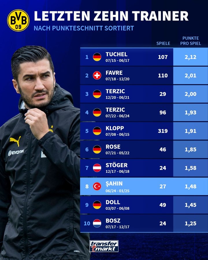德国转会市场揭示多特蒙德历任主帅场均积分排名